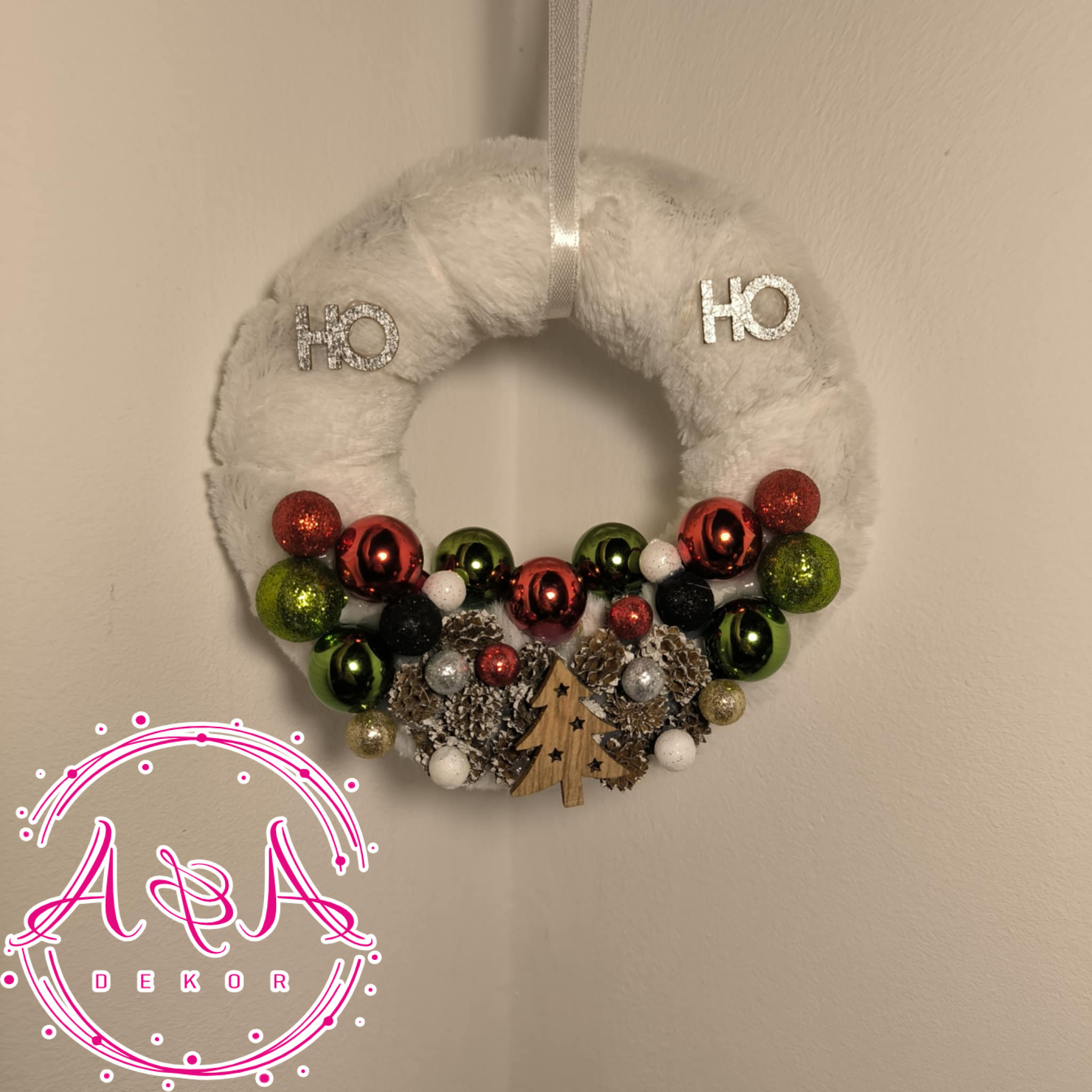 Karácsonyi ajtódísz – puha fehér műszőrmével és törpével